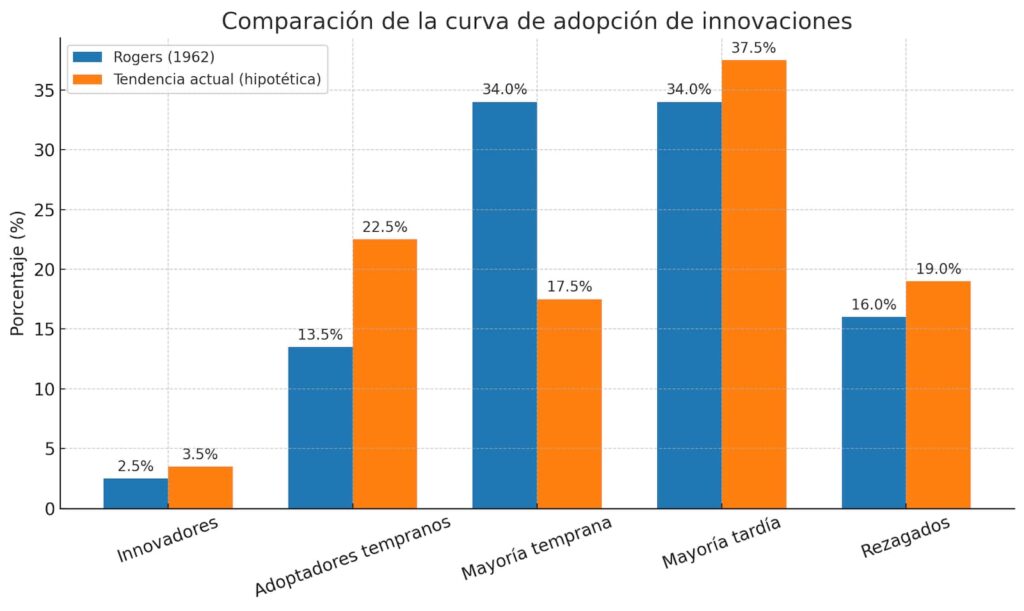Este patrón sugiere que hay muchos más adoptadores tempranos de los que Rogers asoció a esa categoría (24.6% vs 13.5%), y una mayoría temprana más reducida (17.2% vs. 34%) (informationr.net).