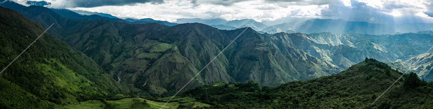 Impresionante vista aérea con dron de los exuberantes valles andinos cerca de Vilcabamba, provincia de Loja, Ecuador. Los rayos de sol se abren paso entre las imponentes nubes, iluminando las crestas y un pequeño pueblo enclavado en el valle. Un paisaje impresionante que muestra la biodiversidad y la belleza natural de la sierra sur del Ecuador.